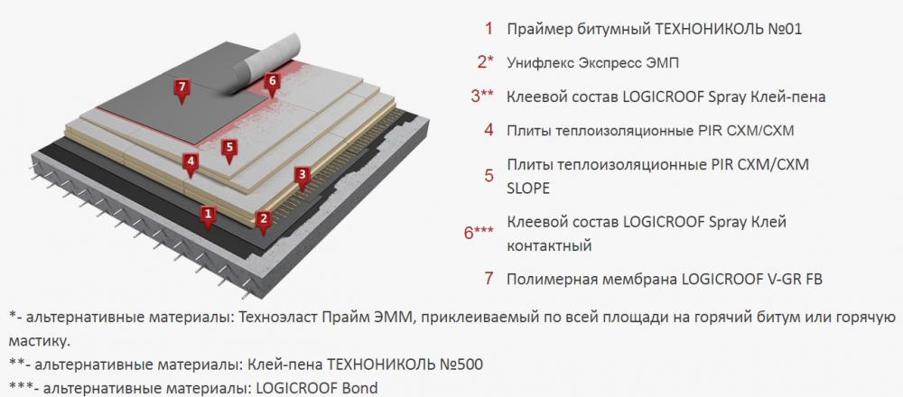 Теплоизоляционный слой в системе ТН-КРОВЛЯ Эксперт PIR выполняется из плит теплоизоляционных PIR с двусторонним кашированием из стеклохолста, которые приклеиваются к пароизоляционному слою, а также скрепляются между собой при помощи клей пены LOGICROOF Spray. При необходимости выполнения на крыше разуклонки и контруклонов используют плиты теплоизоляционные PIR SLOPE. Гидроизоляционный слой выполняется с использованием полимерной мембраны LOGICROOF V-GR FB с флисовой подложкой из ламинированного геотекстиля, который приклеивается к поверхности плит PIR при помощи контактного клея LOGICROOF Spray. Приклеивание мембраны к плитам PIR производится после предварительного подвспенивания клея, что позволяет избежать его впитывания в флис. Стыковка полотен мембраны между собой выполняется горячим воздухом, для чего на поверхности мембраны предусмотрена полоса без флисовой подложки.